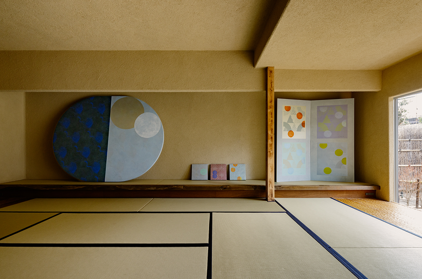 This is an exhibition space where visitors remove their shoes and experience the warmth and textures of natural materials—such as tatami, diatomaceous earth, and reclaimed wood—directly beneath their bare feet.