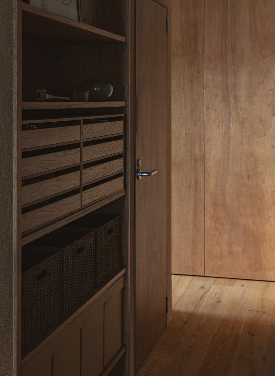 部屋と部屋を仕切る為だけの廊下をなくします。細い空間でも収納や小さな書斎を埋め込み、住まいに必要な居場所を散りばめます。
